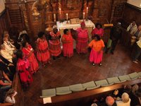 Ihr Gesang wurde durch Trommeln und Rasseln unterstützt. Stimmgewaltig und mit viel Elan sprang der Funke der Freude sofort auf die Anwesenden über. Wippende Füße und rhythmisches Klatschen der Besucher begleiteten den Chor.