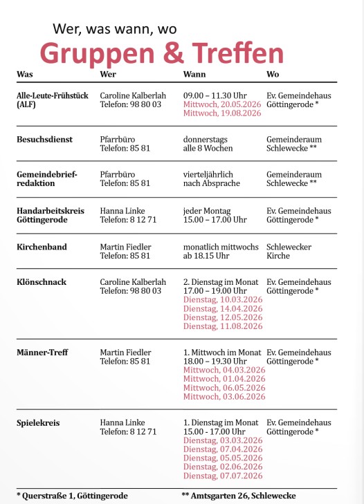 Unsere Kirchengemeinde Schlewecke - Göttingerode mag zwar klein sein, doch das Gemeindeleben ist umso lebendiger. Ob beim "ALF" – dem Alle-Leute-Frühstück in Göttingerode – oder im Spielkreis für Erwachsene: Bei uns ist immer etwas los!