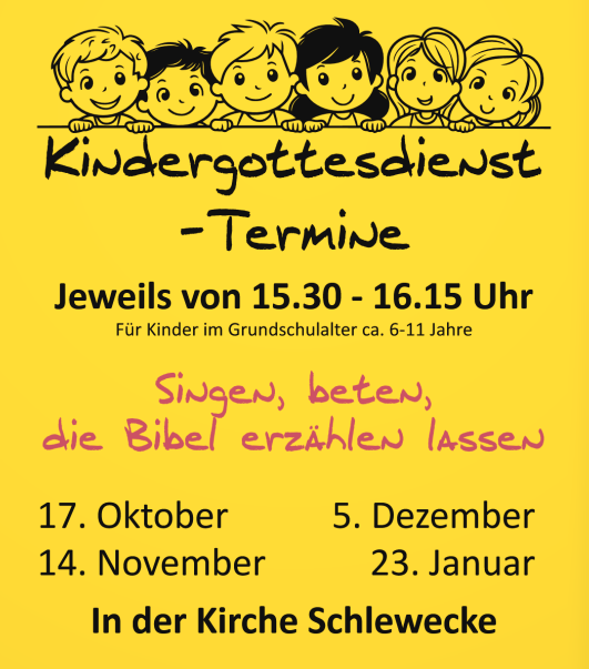 jeweils an einem Freitag im Monat von 15.30 – 16.15 Uhr in der Schlewecker Kirche.